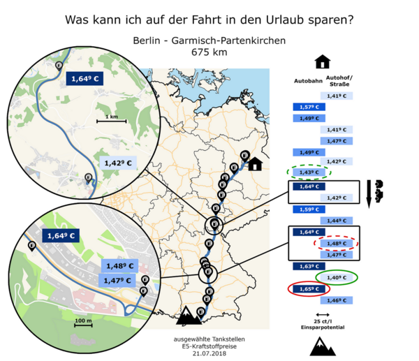 Im Verlauf eines Tages bestehen erhebliche Preisunterschiede zwischen dem durchschnittlich höchsten und niedrigsten Kraftstoffpreisen. So können innerhalb einer Stadt im Tagesverlauf zwischen den teuersten und günstigsten Tankstellen Preisunterschiede von 20 Cent/Liter oder mehr auftreten. An einem Beispiel für Bonn zeigte die Behörde eine Ersparnis von 12 Cent/Liter für eine 10 km lange Pendelstrecke auf (siehe Bild oben). Die Ersparnis bei längeren Reisen wurde mit rund 25 Cent/Liter erwartungsgemäß höher berechnet und am Beispiel einer Reise von Berlin nach Garmisch-Partenkirchen dargestellt (siehe Bild unten). Natürlich können Sie sich auch bei uns stets Ihre Ersparnis entlang einer Route anzeigen lassen.