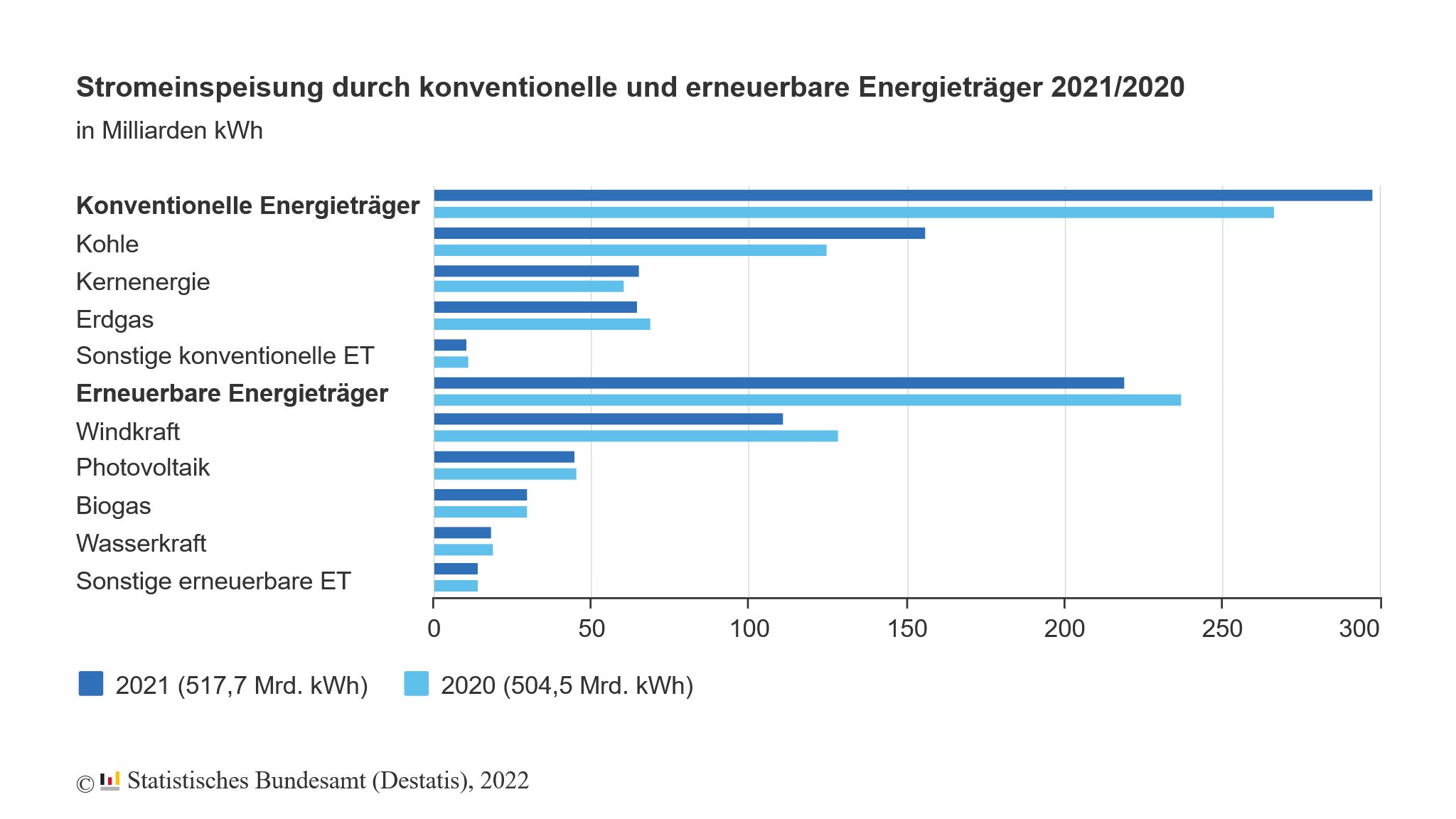 Insgesamt haben die konventionellen Energieträger, auch durch Einspeisung von etwas mehr Atomstrom, den größten Teil der Stromerzeugung ausgemacht. 57,6 % des eingespeisten Stroms stammten 2021 aus konventionellen und 42,4 % aus erneuerbaren Energieträgern. Insgesamt wurden 2021 knapp 518 Milliarden Kilowattstunden Strom ins Netz eingespeist. Das waren laut Destatis 2,6 % mehr Strom als im Vorjahr, aber immer noch 3,1 % weniger Strom als im Corona-Jahr 2019.
